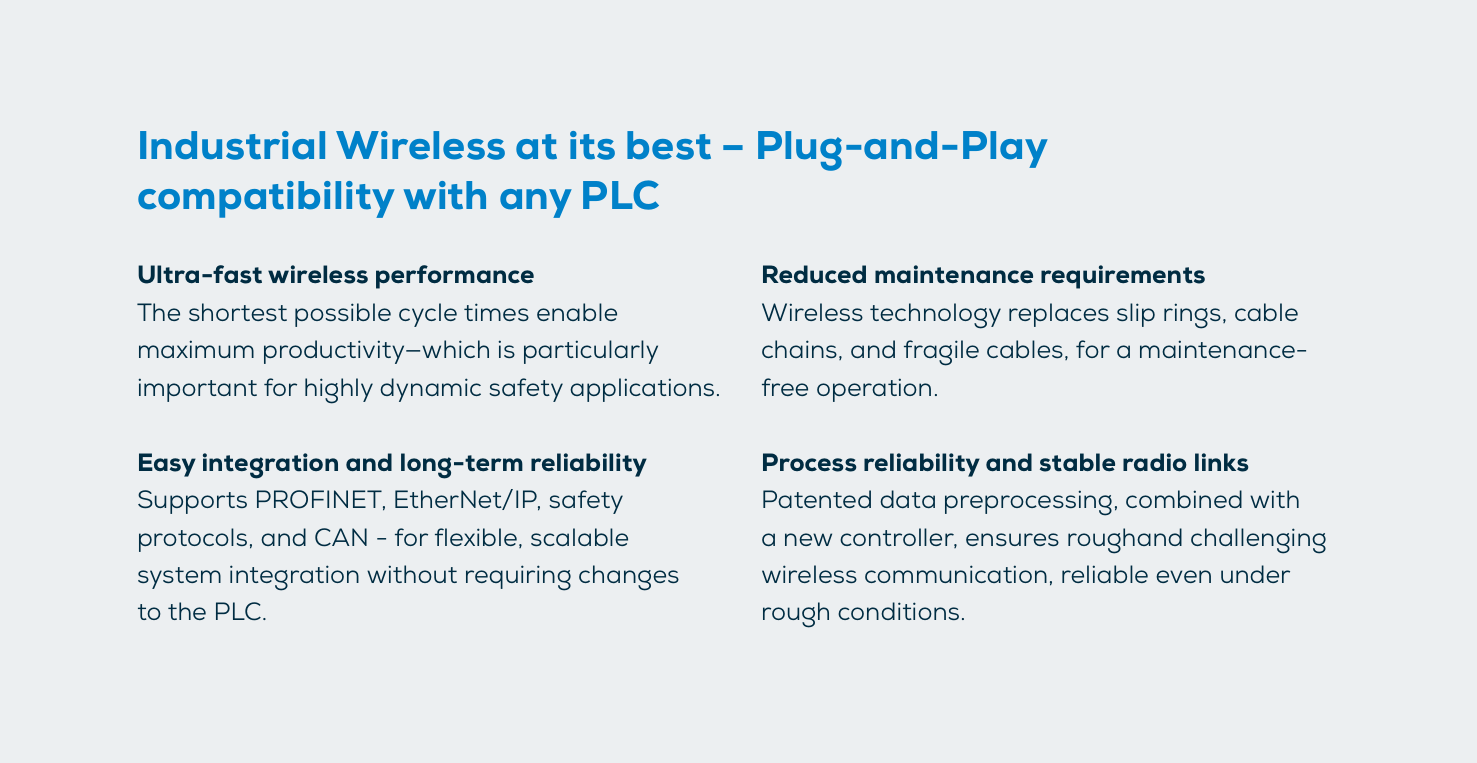 The DATAEAGLE NG X-treme delivers ultra-fast, stable wireless communication with extremely short cycle times—ideal for dynamic and safety-critical applications. Its robust IP67 design ensures reliable performance in harsh industrial environments.