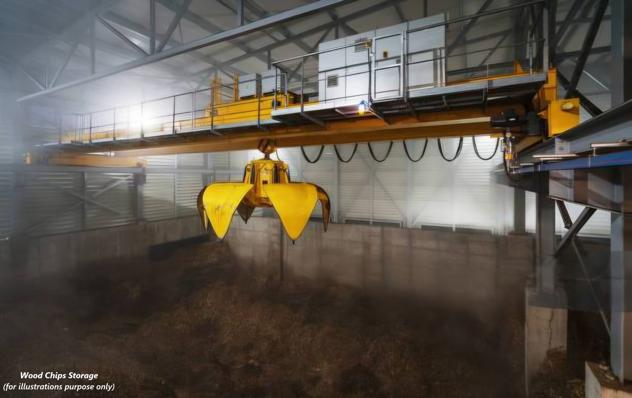 Material handling within the wood chip storage yard is fully automated and relies on a crane system to transport biomass efficiently. However, achieving precise crane positioning proved to be a major challenge. The storage yard is frequently filled with steam generated by the biomass process, which significantly impairs visibility. As a result, conventional positioning sensors were unreliable and unsuitable for the operating environment.